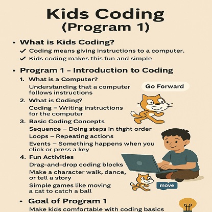 కిడ్స్ కోడింగ్ అంటే ఏమిటి? కోడింగ్ అంటే కంప్యూటర్‌కు ఏదైనా చేయమని సూచనలు ఇవ్వడం. మనం ఇంగ్లీష్ లేదా తెలుగులో మాట్లాడుకున్నట్లే, కంప్యూటర్లు ప్రత్యేక కోడింగ్ భాషలను అర్థం చేసుకుంటాయి. కిడ్స్ కోడింగ్ ఆటలు, పజిల్స్ మరియు కథల ద్వారా దీన్ని సరదాగా మరియు సరళంగా చేస్తుంది.